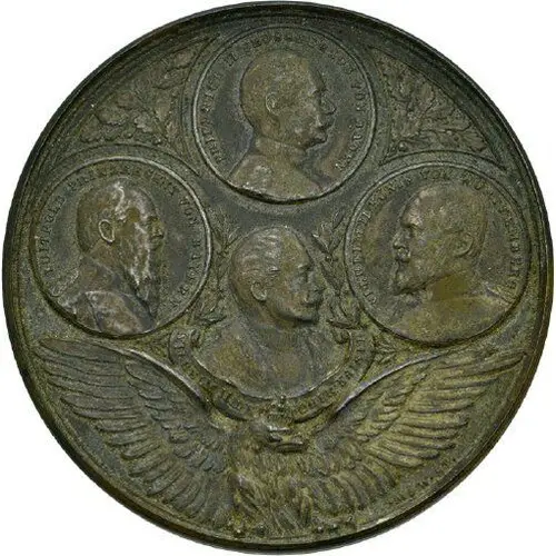 | Aversbeschreibung | The four busts of Emperor Wilhelm II, King Wilhelm II of Württemberg, Prince Regent Luitpold of Bavaria, Friedrich II, Grand Duke of Baden partly in medallions, crowned eagle below. |
