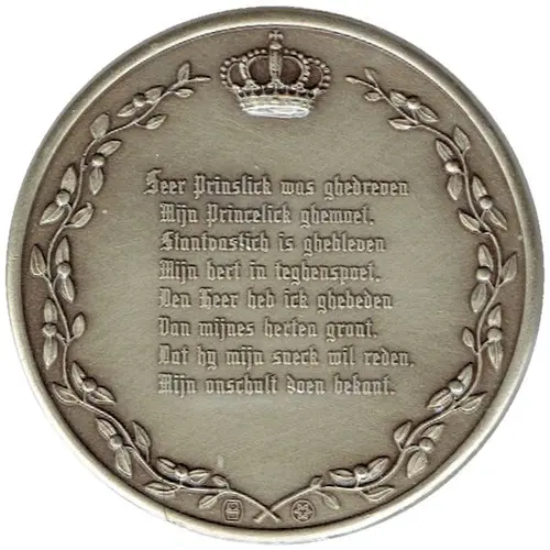 | Obverse lettering | Seer Prinslick(*) was ghedreven Mijn Princelick ghemoet. Standvastich is ghebleven Mijn hert in teghenspoet. Den Heer heb ick ghebeden Van mijnes herten gront. Dat hij mijn saeck wil reden. Mijn onschult doen bekont. *: this is an error. It should be `Christlick` (Translation: Steadfast my heart remaineth In my adversity My princely courage straineth All nerves to live and be. I`ve prayed the Lord my Master With fervid heart and tense To save me from disaster And prove my innocence.) |