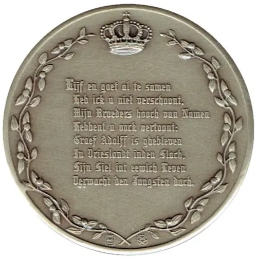 | Obverse lettering | Lijf en goet al te samen Heb ick u niet verschoont. Mijn Broeders hooch van Namen Hebbent u oock vertoont: Graef Adolff is ghebleven In Vriesland inden Slach. Sijn Siel int eewich Leven Verwacht den Jongsten dach. (Translation: Life and my all for others I sacrificed, for you! And my illustrious brothers Proved their devotion too. Count Adolf, more`s the pity, Fell in the Frisian fray, And in the eternal city Awaits the judgement day.) |