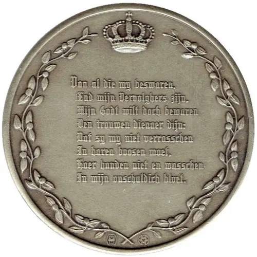 | Obverse lettering | Van al die mij beswaren, End mijn Vervolgers zijn. Mijn Godt wilt doch bewaren Den trouwen dienner dijn: Dat sy my niet verrasschen In haren boosen moet. Hoer handen niet en wasschen In mijn onschuldich bloet. (Translation: My God, I pray thee, save me From all who do pursue And threaten to enslave me, Thy trusted servant true. O Father, do not sanction Their wicked, foul design, Don`t let them wash their hands in This guiltless blood of mine.) |