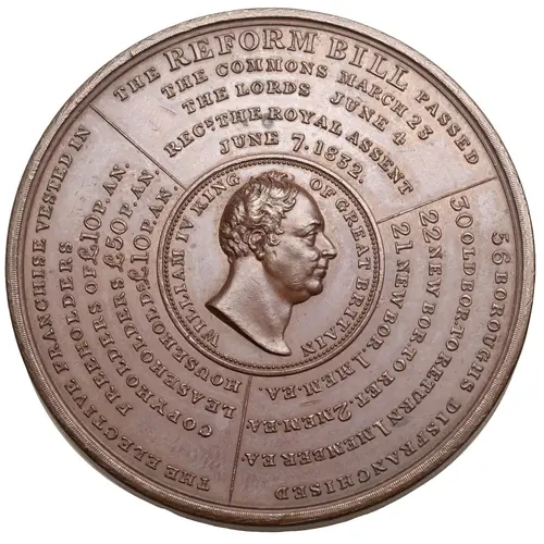 THE REFORM BILL PASSED THE COMMONS MARCH 23 THE LORDS JUNE 4 RECD. THE ROYAL ASSENT JUNE 7.1832 56 BOROUGHS DISFRANCHISED 30 OLD BOR. TO RETURN 1 MEM. EA. 22 NEW BOR. TO RET. 2 MEM. EA. 21 NEW BOR. 1 MEM. EA. THE ELECTIVE FRANCHISE VESTED IN FREEHOLDERS COPYHOLDERS OF f 10 P . AN . LEASEHOLDERS £30 P . AN. HOUSEHOLDERSs. £10 P . AN. WILLIAM IV KING OF GT. BRITAIN |