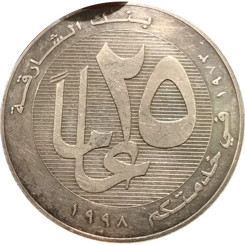 | Obverse lettering | بنك الشارقة ٢٥ عاماً ١٩٧٣ في خدمتكم ١٩٩٨ (Translation: Bank of Sharjah 25 years 1973 in your service 1998) |