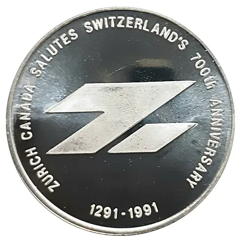 | Obverse lettering | ZURICH CANADA SALUTES SWITZERLAND`S 700th ANNIVERSARY 1291 - 1991 |