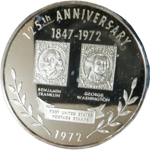 | Obverse lettering | 125th ANNIVERSARY 1847-1972 BENJAMIN FRANKLIN GEORGE WASHINGTON FIRST UNITED STATES POSTAGE STAMPS 1972 WDA |