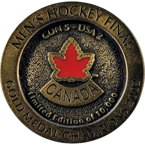 | Obverse lettering | MEN`S HOCKEY FINAL CDN 5 - USA 2 CANADA Limited Edition of 10,000 GOLD MEDAL CHAMPIONS 2002 |
