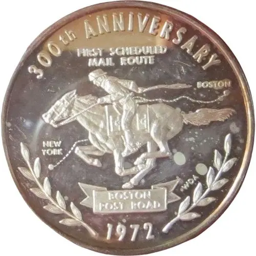 | Obverse lettering | 300th ANNIVERSARY FIRST SCHEDULED MAIL ROUTE NEW YORK BOSTON BOSTON POST ROAD 1972 WDA |