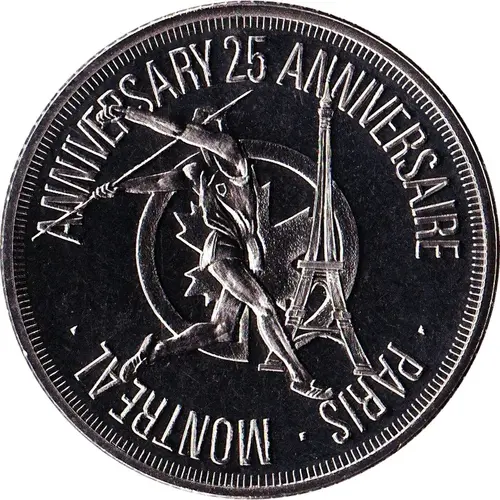 | Obverse lettering | ANNIVERSARY 25 ANNIVERSAIRE · PARIS · MONTREAL · |
