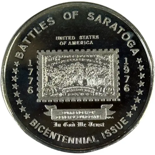 | Obverse lettering | BATTLES OF SARATOGA UNITED STATES OF AMERICA 1777 ORISKANY 1927 UNITED STATES POSTAGE SURRENDER OF GENL BURGOYNE SARATOGA 2 CENTS 2 1776 1976 SURRENDER OF GENERAL BURGOYNE WDA In God We Trust BICENTENNIAL ISSUE |