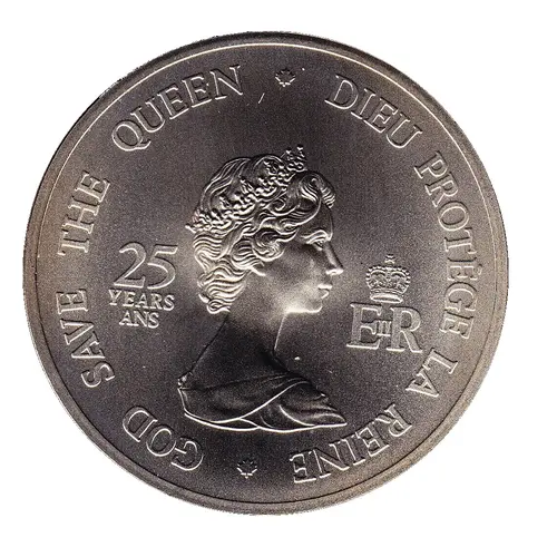 Profile of Elizabeth II crowned, with the inscription 25 years/ans on her left and the monogram of Queen Elizabeth II on her right, surmounted by the crown of Saint Edward. All around is the inscription `God save the queen`. |