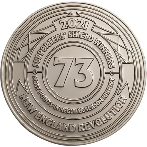 | Opis líce | 2021 SUPPORTERS` SHIELD WINNERS 73 MOST POINTS IN REGULAR SEASON HISTORY NEW ENGLAND REVOLUTION |