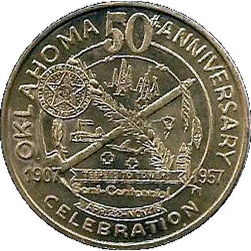 | Obverse lettering | Oklahoma 50th Anniversary 1900 - 1957 Teepees to Towers Celebration |