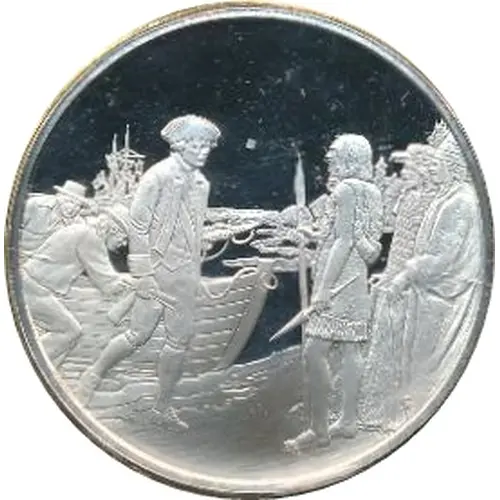 James Cook greeting Western Canadian dignitaries with the HMS Discovery in the background and his crewmates behind him pulling a smaller boat ashore |