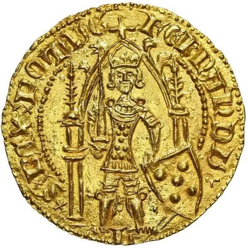 | Obverse description | Lisbon mint, the king standing facing, crowned and in full armour, holding sword and leaning on shield bearing five besants, within Gothic portico, small crosses in fields to left and right, rev., floriate cross within quadrilobe, small arms on hexalobe in centre, rosettes in spandrels |
