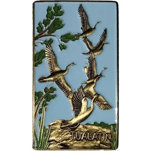 | Obverse description | A raised scene of birds flying in the air, a couple branches and a rock with the words TUALITIN in the right corner. |
