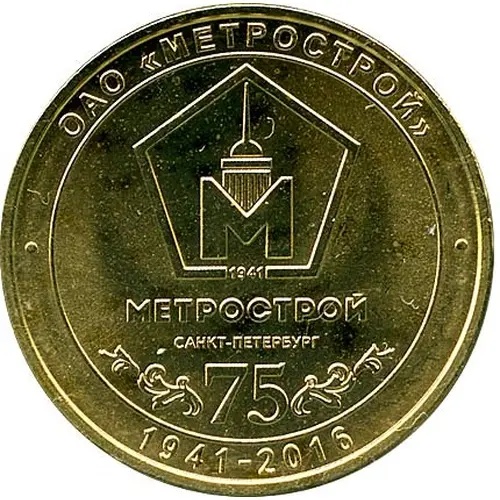 | Obverse lettering | ОАО «МЕТРОСТРОЙ» М 1941 МЕТРОСТРОЙ САНКТ-ПЕТЕРБУРГ 75 1941-2016 (Translation: JSC Metrostroy Metrostroy St. Petersburg) |
