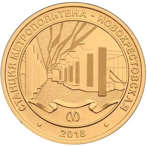 | Obverse lettering | СТАНЦИЯ МЕТРОПОЛИТЕНА `НОВОКРЕСТОВСКАЯ` М • 2018 • (Translation: Metro Station Novokrestovskaya) |