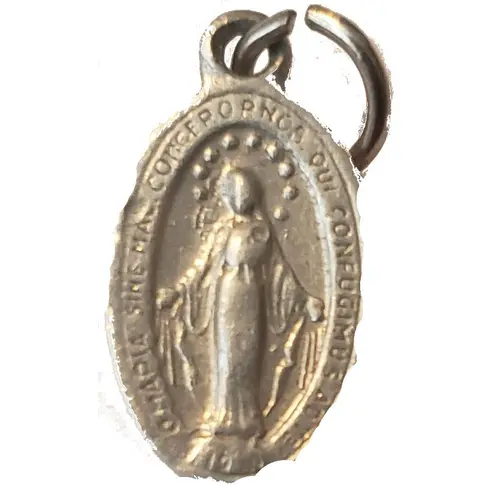 • Mary stands on a globe, crushing a serpent beneath her feet. Describing the original vision, Catherine said the Blessed Mother appeared radiant as a sunrise, `in all her perfect beauty.` • Rays shoot out from Mary`s hands, which she told Catherine, `... symbolize the graces I shed upon those who ask for them.` • Words from the vision form an oval frame around Mary: `O Mary, conceived without sin, pray for us who have recourse to thee.` |