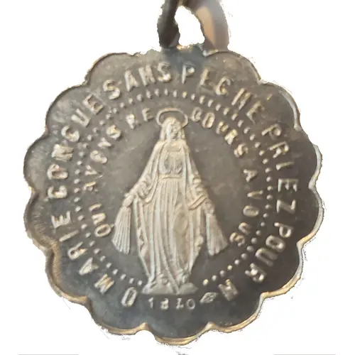 O MARIE CONCUE SANS PECHE PRIEZ POUR N. QUI AVONS RE COURS A VOUS 1830 (Translation: O Mary, conceived without sin, pray for us who have recourse to thee.) |