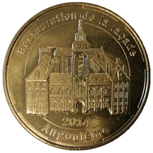 On the periphery the word France written in eight languages. France at 12 o`clock, 2017 at 6 o`clock, the whole linked by 14 stars on the right and on the left. In the center, the building of the currency of Paris. |