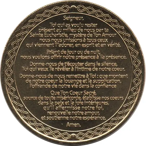 On the periphery, the word France written in eight languages. France at 12 o`clock, 2013 at 6 o`clock, the whole linked by 14 stars on the right and on the left. In the center, the building of the Monnaie de Paris.