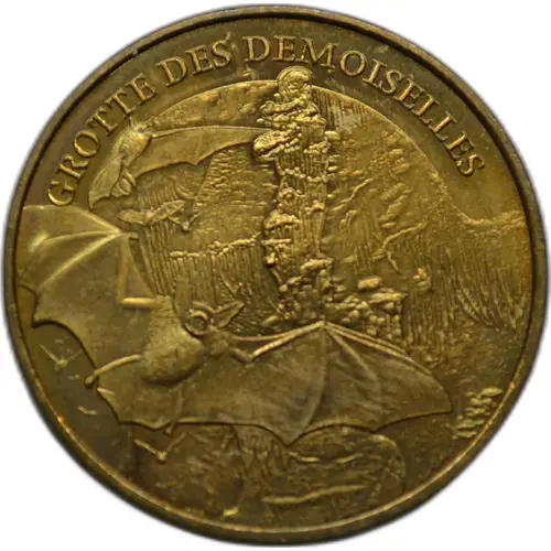 Several bats in front of the concretion of the Virgin and Child in the Grotte des Demoiselles in Ganges, a French commune in the Hérault department, Occitanie region. |