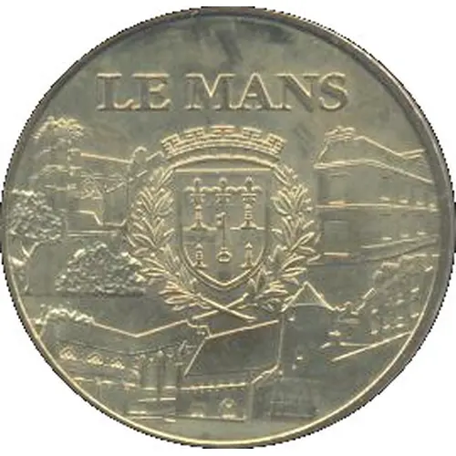The coat of arms of the city of Le Mans surrounded by Le Mans Cathedral top left, the Archaeology Museum top right, Epau Abbey bottom left and the old fortifications bottom right. |