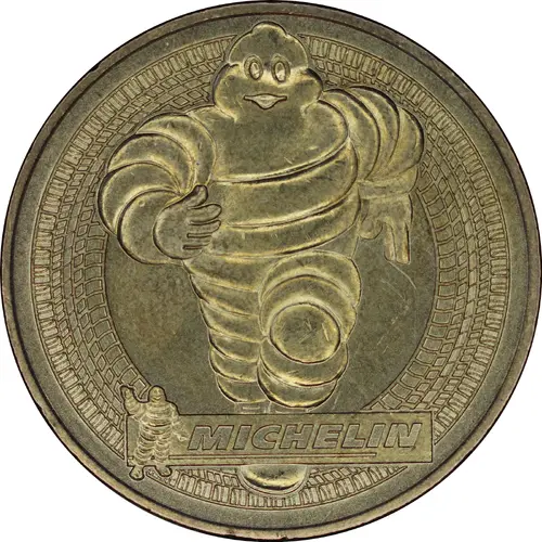 Representation of the industrialist`s mascot, the Michelin Man, in the center of a tire at the Michelin Group Museum in Clermont-Ferrand, a French town in the Puy-de-Dôme region, Auvergne-Rhône-Alpes. |