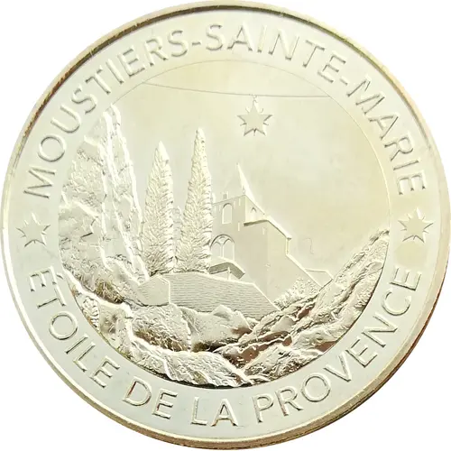 Text around the edge. Representation of the star above the village of Moustiers-Sainte-Marie, a French commune in the Alpes-de-Haute-Provence department, Provence-Alpes-Côte d`Azur region.