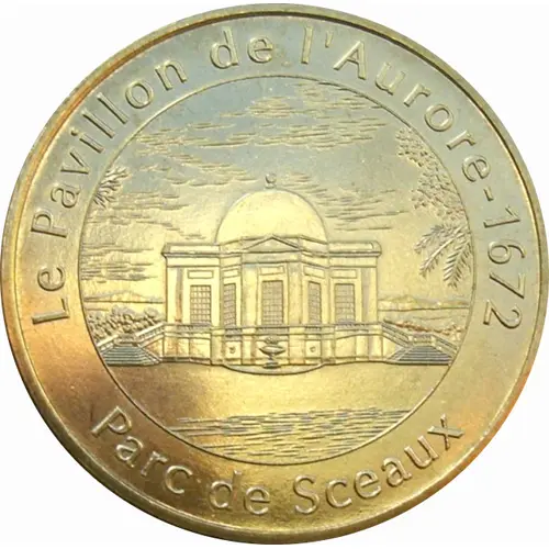Text on the periphery. In the center, the Aurore pavilion in the park at Sceaux, a French commune in the Hauts de Seine department, Île de France region. |