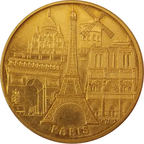 The Eiffel Tower in the center, the Moulin Rouge on the right at the top, the Sacré Coeur on the left at the top, the Arc de Triomphe on the bottom left, the Notre Dame de Paris cathedral on the right at the bottom. |