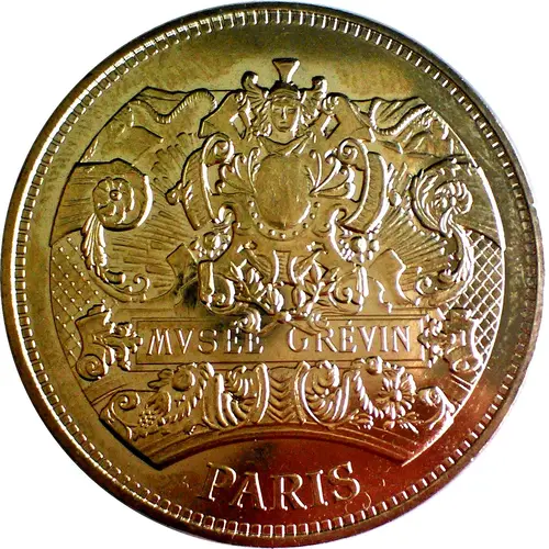 On the periphery the word France written in eight languages. France at 12 o`clock, 2015 at 6 o`clock, the whole linked by 14 stars on the right and on the left. In the center, the building of the currency of Paris. |