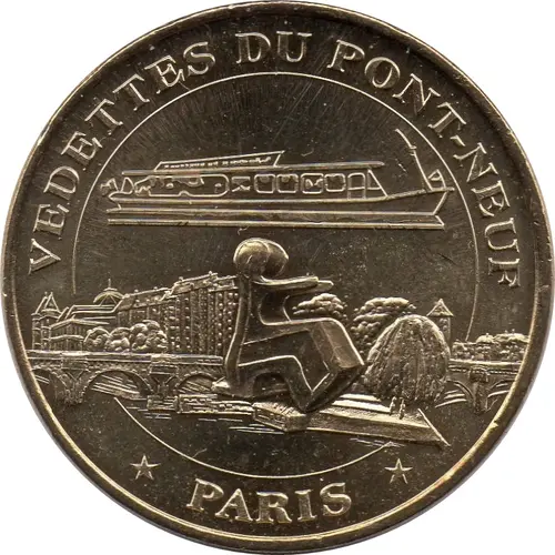 The obverse depicts the Sisley, one of the Vedettes du Pont-Neuf boats, with, in the foreground, the statue found on the bow of each of the boats in this site`s fleet. |