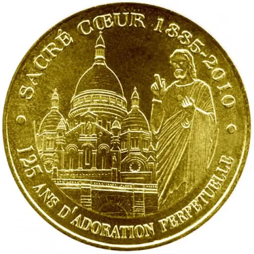 On the periphery, the word France written in eight languages. In the center of a hexagon, the Monnaie de Paris building surrounded by a circle of stars interrupted by the year. |