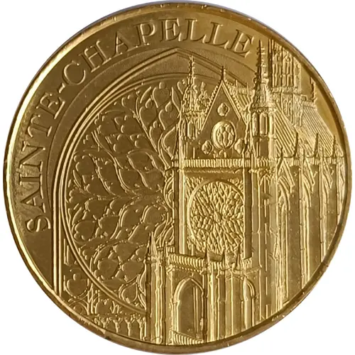 Representation of the Sainte-Chapelle church in Paris 1st on the background of a stained glass window. |