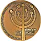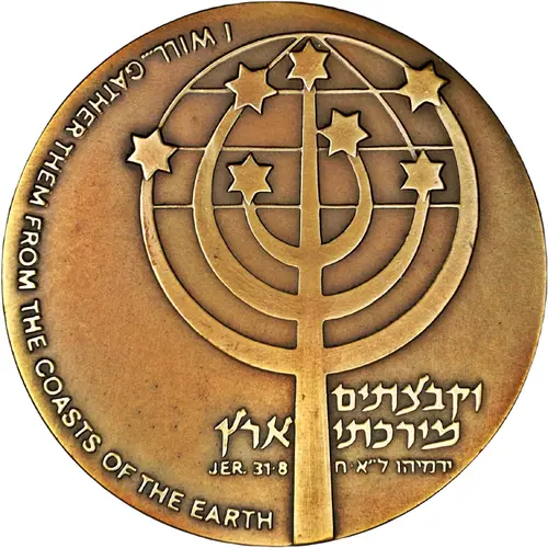 The light of the seven canes with the earth, as a symbol of the connection between the State of Israel and the Diaspora. Scattered David shields express the diaspora. Below, the verse `I will gather them from the coasts of the earth. Jeremiah 31:8`. The translation of the verse is on the left margin. |