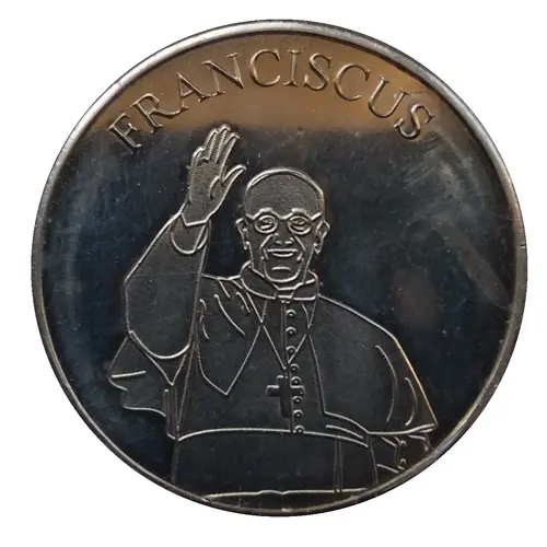 | Obverse description | Pope Francis, half body, saluting with his right hand, his name above. |