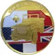 | Popis líce | Military vehicle atop flags with lettering above. |