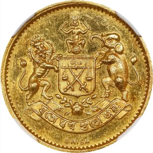 | Descripción del anverso | Coat of Arms of Cooch Behar - Lion and elephant supporters of a shield with a sword, sword blade crossed under scales. Monkey above and banner with moto below. Flower below. `GIRSH` below |