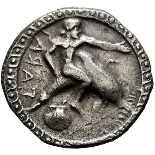 Obverse description Taras, nude, riding dolphin right, extending left hand, right hand resting on dolphin`s back; TARAS (retrograde) to left, scallop shell below, dot-and-cable border around.
