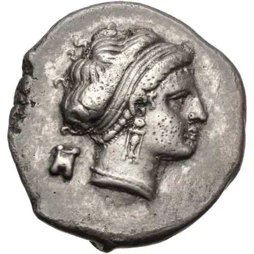 | Obverse description | Head of nymph right, hair in band; astragalos behind neck |