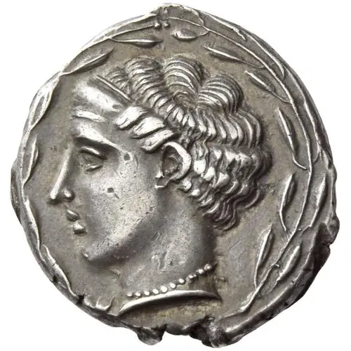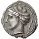 | 表面の説明 | Head of the nymph Terina facing left, hair bound in an ampyx, wearing necklace. All within an olive-wreath |