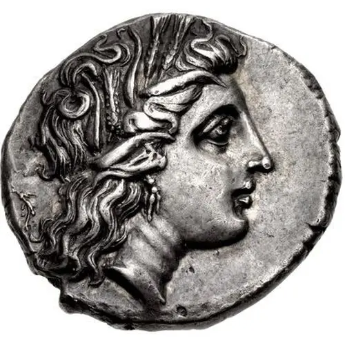 | Ön yüz açıklaması | Head of Demeter right, wearing wreath of grain ears, triple-pendant earring, and necklace; wreath behind neck. |