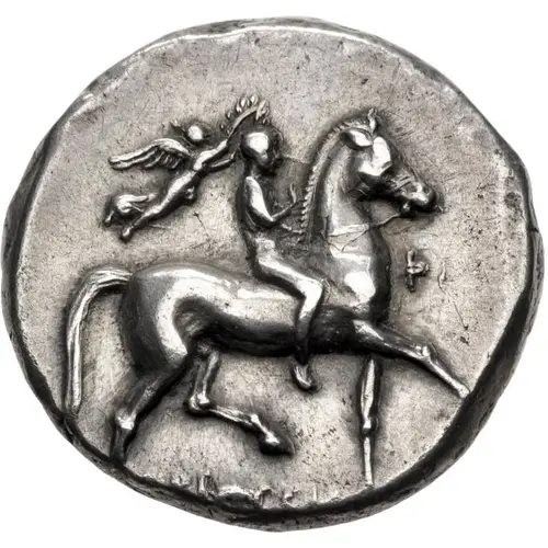 | Obverse description | Youth, nude, placing right hand on mane, and holding rein in left, on horseback right; to left, Nike flying right, crowning him; ΦI to right, APIΣTEIΔAΣ below. |