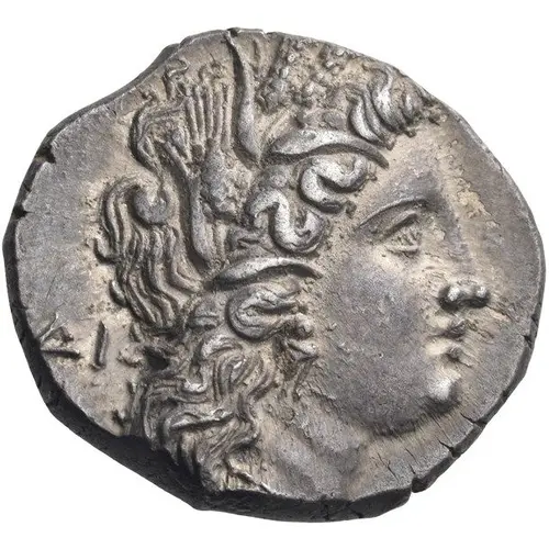 | توضیحات روی سکه | Head of Demeter to right, wearing wreath of barley ears, triple-pendant earring and pearl necklace. |
