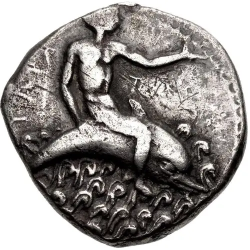 | توضیحات روی سکه | Taras seated right on dolphin, left arm extended, waves below. |