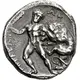 توضیحات پشت سکه Heracles standing right with club in right hand, strangling the Nemean lion.
