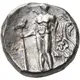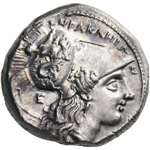 | Obverse description | Head of Athena to right, wearing Corinthian helmet adorned with a figure of Skylla hurling a rock right on the bowl, a pendant earring and a simple necklace; behind Athena`s neck, E. |