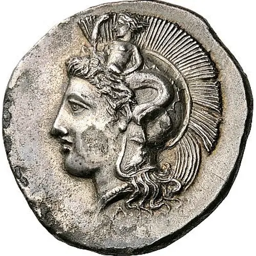 | Obverse description | Head of Athena to left, wearing Attic helmet adorned with a figure of Skylla raising her right hand in the gesture of aposkopein and below neck, Α |