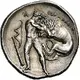 | Reverse description | Herakles, nude, standing right and strangling the struggling Nemean lion with both hands. To left, club and bow and above to the left, Α |