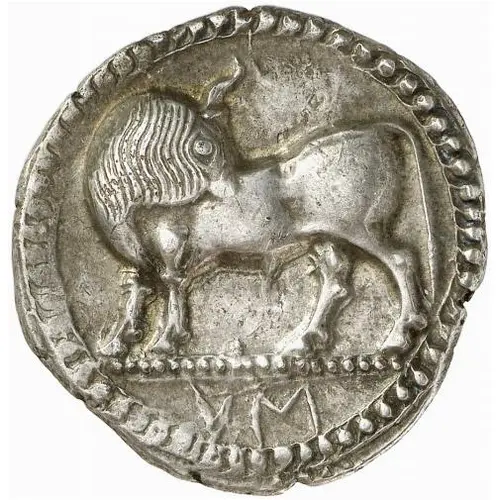 Reverse description Bull standing to right, on dotted ground line. Around it, a border of dots and all as incuse
